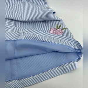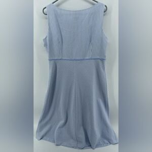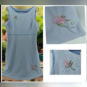 Vintage Seersucker Blue White Striped Embroidered Floral Women's Size 12 Spring Summer Wedding Guest Garden Party Business Casual Cottagecore Shabby Chic Coastal Vacation Y2k Retro Sleeveless Sundress Lined Side Zipper Sun Dress Picnic Carter Cowboy
