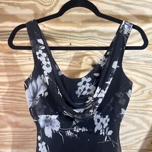 Empire waist. Cowl neck. Fully lined. Sheer dress with tiny sequins. Zips up the back.