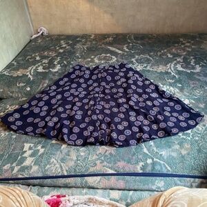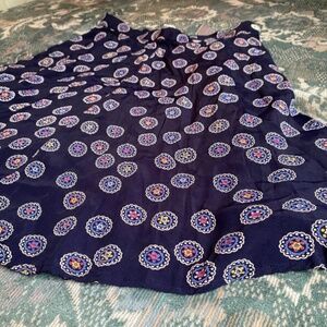 This is a pre-owned Banana Republic skirt, size 4, made of 100% rayon. It is a navy blue skirt with a circle pattern in pink, yellow, and blue. The skirt is a-line in shape and has a zipper closure in the back. The skirt is in good condition with no visible Women imperfections. The skirt is approximately 20 inches long and has a waist measurement of approximately 28 inches. The skirt is made in Malaysia.