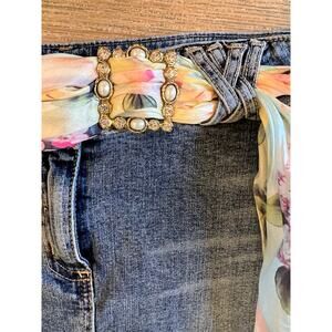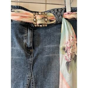 Vintage 90s Y2K ABS patchwork denim skirt, size 30, listing as a M due to vintage sizing running smaller. Good preowned condition with cute silky floral scarf belt, cotton elastine blend. Note 1 snap is loose - see photo