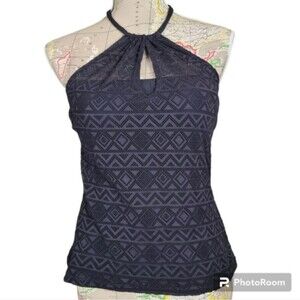 This is a vintage Y2K Apt 9 black Aztec sheer lace strappy halterneck blouse with a bandeau liner available in a size Medium. This Y2K halter top is brand new without tags and features a stylish and trendy design.