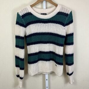 Cozy and classic vintage Y2K striped sweater by Abercrombie & Fitch in women’s size XS. Crafted from a soft wool and alpaca blend, it features wide horizontal stripes in green, navy, and cream with a slightly open knit texture. Perfect for layering and capturing that preppy, retro vibe.