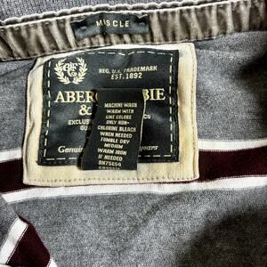 Vintage Y2K muscle polo collared shirt from Abercrombie and Fitch, men's size large. Slim fit. Gray with maroon stripes, preppy rugby style. Cotton and sturdy, machine washable. Flaw on hem--small tear in two places, front and back. See photos.