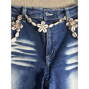 The product is a pair of vintage Y2K acid wash denim bootcut flare jeans with a unique surf sea shell belt. These jeans are made in the USA and feature a solid blue color with a regular fit. The fabric is cotton denim with an acid wash finish, making them a stylish choice for the retro and hippie-themed fashion. The belt adds a playful touch to the design, perfect for those who appreciate a mix of vintage, beachy, and city-inspired elements in their wardrobe.