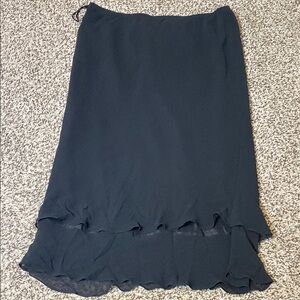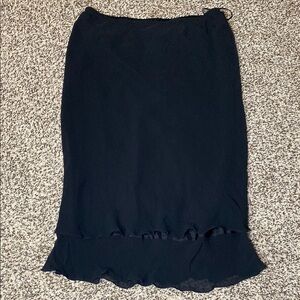 This Y2K knee-length black pencil skirt by Adrianna Papell features a chic ruffled hem, perfect for work, cocktail events or dress down. Its sleek design and smooth stretchy waistband offer a flattering fit. 100% silk, lightweight and versatile, wear high or low-waist. Size 10. Waist 14.5”. Length 28”.