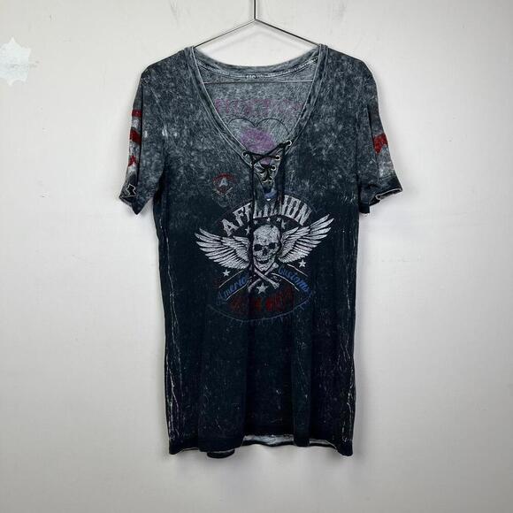 Unleash your edgy style with this Affliction Vintage Skull T-Shirt. Featuring a unique distressed finish, this shirt combines comfort and standout design that’s perfect for any casual outing. Key features include: - Eye-catching skull graphic with wings - Stylish lace-up neckline - Vintage-inspired distressed look - Soft, breathable fabric for all-day comfort - Suitable for layering or wearing solo. Grab this statement piece today and elevate your streetwear collection!