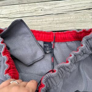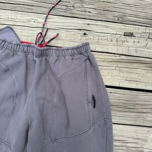 These pants channel that gritty discount mall urban wear energy — baggy fit, heavy cotton, patch logo on the thigh, and ankle zips that scream sports team warmups turned lifestyle streetwear. The muted gray with paneled stitching gives them a utilitarian, almost tech-athletic vibe, while the elastic waist and embroidered patch lock it straight into that Y2K mall sports shop aesthetic (think old Champs Sports racks or random flea market finds next to FUBU, Southpole, and Akademiks).