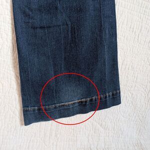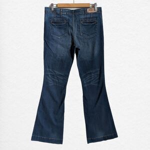 Vintage 2000s (Y2K) Allen B (Allen Schwartz) low rise flare jeans. Dark wash denim with purposeful fading. Whiskering at thighs. Jeans are in good vintage condition with light wear, including small stain on seat of pants and wear to leather label. Please see photo.