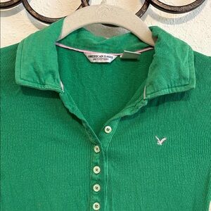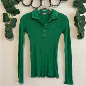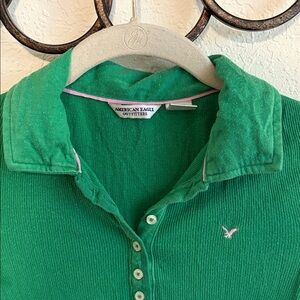 Vintage Y2K/early 2000's adorable retro preppy American Eagle vibrant Kelly Green colored Long-Sleeved ribbed top with cute Pink embroidered logo and accents! Button-Up neck and collared design. Great preowned condition other than one discoloration spot (pictured). Tagged size S. Best for XS/S.