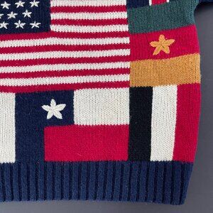 Rare vintage American Eagle Outfitters Shetland wool sweater featuring a bold patchwork of international flags including the USA. Constructed from 100% Shetland wool, this heavyweight knit delivers warmth, texture, and timeless preppy style.