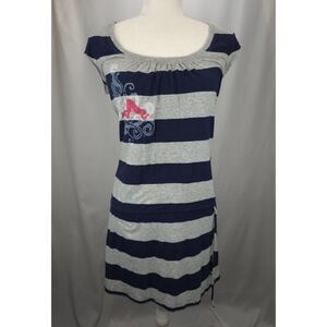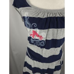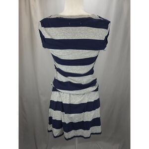 In very good condition. Navy blue and gray stripe. Shirt was customized with a print on the chest. Measurements are approximate - 15 1/2" pit to pit, 35 1/4" length with the drawstring untied. The dress can be draped to be shorter or worn as a tunic over leggings.