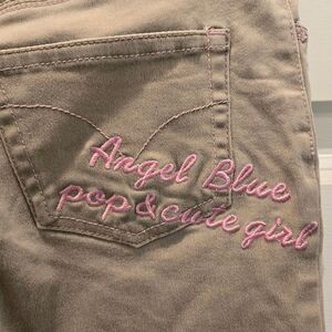 Excellent pre-owned condition with no noticeable flaws. Measurements (approximate): 25” waist. 33” length. 9.5” low rise. 23” inseam. Retro/Vintage inspired bootcut jeans, channeling Y2K fashion trends. Japanese brand from the 90’s to early 2000’s. Short girl friendly. Beige/Khaki color-way. Unique patches featuring Angel Blue branding like "est. 1989", "GOITHE ANGEL BLUE EST. 1989", and "HAVE A NICE TIME", plus a charming cartoon character patch. Mid-rise with standard belt loops. Material: Likely a cotton blend. Perfect for casual wear, adding a unique, nostalgic touch to any outfit. bootcut, kawaii, retro, patchwork, neutral, beige, streetwear, Kawaii, comfy, sexy, flattering, cute, character, kitschy, kidcore, pastel, breathable, lightweight, stretchy, J fashion, spring, summer, vacation, schoolgirl, light academia.
