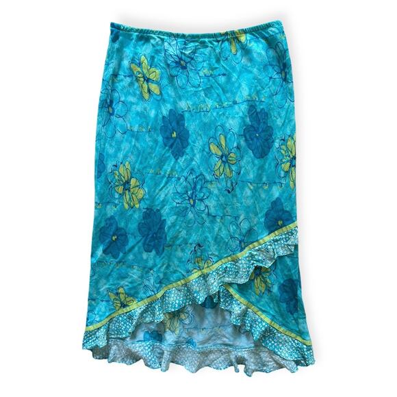 Vintage Y2K Anne Carson Ruffled High Low Slip Skirt Blue Lime Green Floral L
