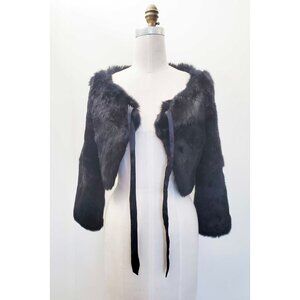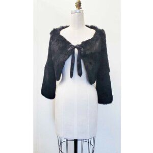Vintage Y2K BEBE Black 100% Rabbit Fur Silk Bow Crop Bolero Shawl Jacket S