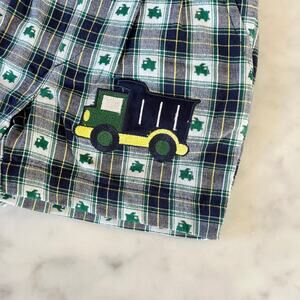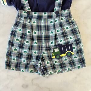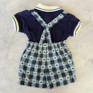 Vintage Y2K baby boy truck appliqué plaid overalls and polo outfit. Marked a size 12 months. New without tags-- the collar has some faint marks that should wash out. The polo has straps attached on the back shoulders for the overall straps. The overalls have a button closures and elastic on back waist. They have the cutest truck plaid print! Truck appliqué at leg.