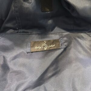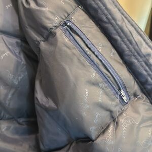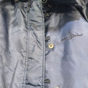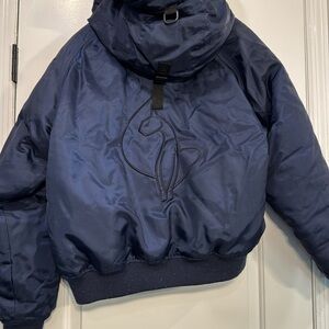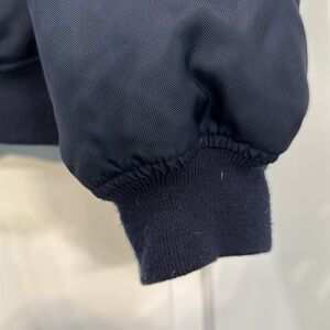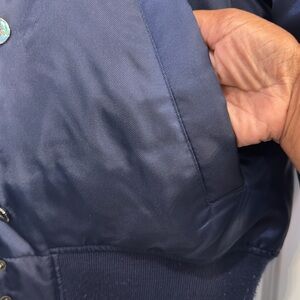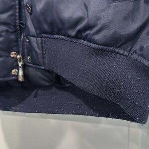Stylish navy hooded bomber jacket. Features a front zip and button closure. Silver buttons. Front pockets. Pocket on sleeve. Overall great condition. Fuzz balls bottom hem.