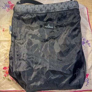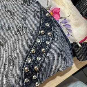 his is a quintessential vintage Baby Phat backpack that captures the essence of the Y2K era. The bag features a denim-like material with the iconic Baby Phat cat and "BP" monogram pattern repeated all over. It has a drawstring cinch closure at the top, a gold and silver metal Baby Phat logo plaque, and is accented with black faux snakeskin panels embellished with metal studs and rhinestones. It has adjustable black nylon straps, a black satin-like interior, and a small interior zip pocket. This backpack is the perfect accessory to complete a Y2K streetwear or hip-hop-inspired look.