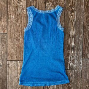 Enhance your wardrobe with this ribbed tank top, featuring delicate lace trim for a touch of elegance. Made from 100% cotton, it offers comfort and breathability, ideal for warm weather. Its versatile blue shade pairs effortlessly with various bottoms, making it a stylish addition to your collection.