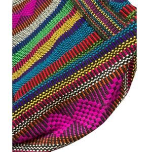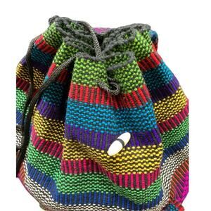 Bohemian style multicolored woven backpack with draw string top with resin button and front pocket.
