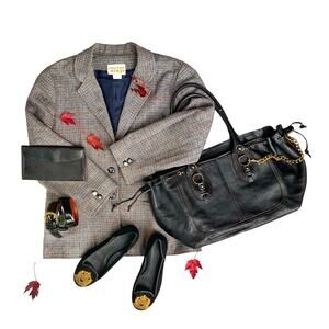A plaid blazer, wool trousers, and loafers — or your favorite denim and a camel coat. Pairs beautifully with leather belts, gold jewelry, and our vintage Coach + Ralph Lauren staples.