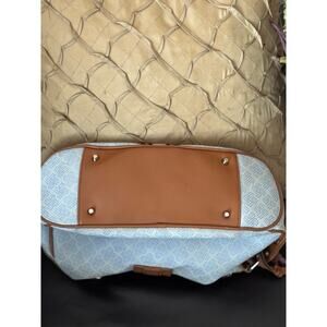 Vintage Y2K Bandolino Monogram Shoulder Bag Unique structured Bandolino shoulder bag in a soft blue geometric print with tan leather trim and silver-tone hardware. Zip-top closure, adjustable shoulder strap, structured silhouette w/vintage shape, clean interior, well-kept condition, one owner.