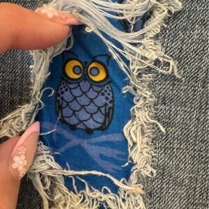Good preowned condition. Some gems missing from belt loops. Distressed area on front top right leg has a blue handkerchief with owls on it sewn in by me about 25 years ago, lol. This is easily removable with just a few snips. Crystals are a pretty blue color.