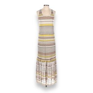 Lovely neutral beige/khaki/yellow stripe sleeveless Linen/Viscose knit midi dress with removable slip dress underneath. This is a two for one!