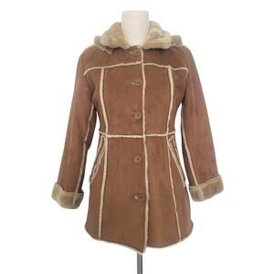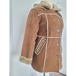 Vintage Y2K Big Chill Penny Lane Suede Hooded Coat Size XS Tan Boho Hippie 70's