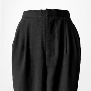 A black pair of high waisted pants that tapers at the bottom. Hook and zipper closure. No pockets. Thrifted. No tags