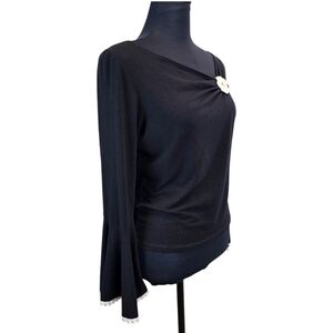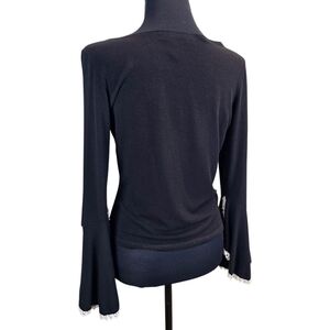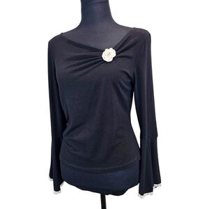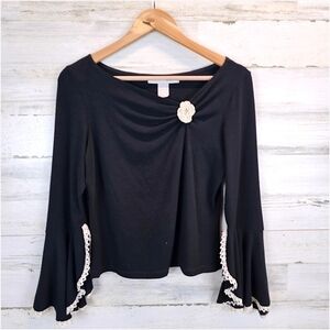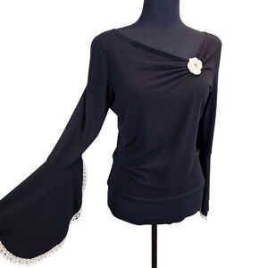 Channel timeless romance with this vintage-inspired black knit top, featuring dramatic flared bell sleeves, lace-trimmed cuffs, and a delicate floral rosette appliqué at the neckline. With its soft stretch fabric and subtle off-shoulder ruched detail, this piece is equal parts coquette and dark academia dream.