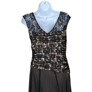 This vintage Y2K black lace chiffon evening dress by Signature by Sangria channels dark romance and elegance with a touch of Whimsigoth glamour. The ruched floral lace bodice overlays a nude lining for a soft illusion effect, paired with a flowing chiffon skirt and draped dropped waist sash accented by a rhinestone buckle. The silhouette moves beautifully and flatters the figure with its defined waist and cap sleeves.