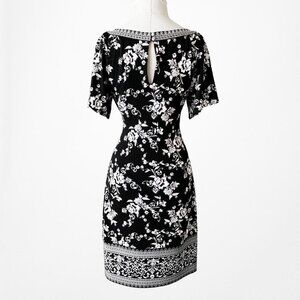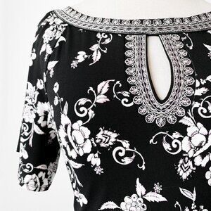 A black short sleeve knit knee length dress featuring a floral geometric print, boat neck, and keyhole cutout. Zips up in the back. Unlined. Pre-loved. Excellent. No visible stains or tears