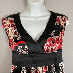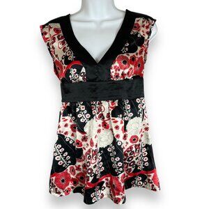 Vintage Lia Lee red, white, and black V-neck blouse with floral design and black trimmed V-neck and empire waist. Narrow tie in back. Material tag is faded but feels like a silky polyester.