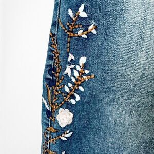 A dark wash vintage pair of five pockets high waisted denim jeans featuring floral embroidered details on the side. Zips up and buttons at the waist