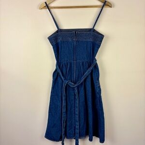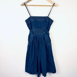 Adorable Y2K dark blue mini dress with a smocked bodice and tie waist. Spaghetti straps and empire waist with full skirt. Perfect for casual outings.
