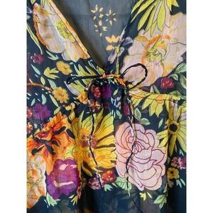 Vintage Y2K Boho Lemon Collection Floral Sheer Deep V Mini Dress Swim coverup