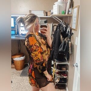Such a beautiful dress & perfect for the Y2K movement. The bright florals on this scream spring & summer while the sheer breathable feel keeps you cool & trendy. Wide sleeves & a deep v neck with a functional tie at the chest. It’s giving Boho Spice Girls.