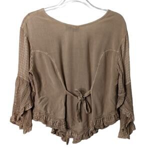 Vintage Y2K Boho Peasant Blouse Tan Eyelet Tie Back Flutter Sleeve Romantic Top