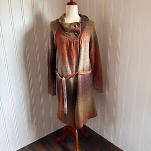 This vintage Y2K Art and Soul sweater duster is a size medium. This sweater has an ombre pattern in green, orange and brown. It falls to midi length, buttons on the neck and ties at the waist. It's an acrylic/wool blend and hand wash. This gem has boho vibes and is in good vintage condition.