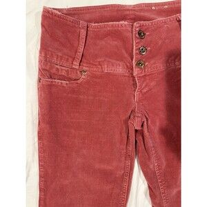 The product is a pair of Vintage Y2K Bongo Super Low Rise Corduroy Flare Jeans for women in size 3 Short (7S). These 90s prep jeans feature a solid pink color with a medium fabric wash and a low rise fit. Made from a blend of spandex and cotton corduroy fabric, these jeans have a zip and button closure, embroidered accents, and a flared style. Perfect for various themes such as festival, hippie, bohemian, retro, and hipster, these vintage jeans also have a comfortable fit with shaping features and pockets for added convenience.