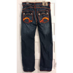 Vintage Y2K Laguna Beach Jeans 100% Cotton Blue Designer Streetwear Grunge Skater Gorpcore Hip Hop Biker Rider Mid Rise Embroidered Distressed 5-Pocket Bootcut Denim Jeans with Thick Stitching, Whiskers, Fading, Skull Buttons & Graphic Skull Logo