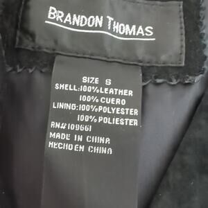 vintage suede leather jacket women's size small brand Brandon Thomas Patchwork leather black suede outer with internal polyester lining fitted '90s Y2K vibes measurements length 25. flat across underarm 20" Gently pre-owned condition!