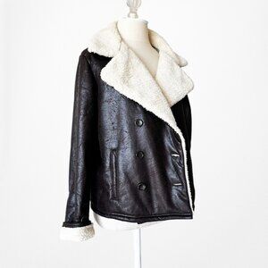Faux leather exterior shell. Double breasted front button closure. Very soft faux fur lined inside. Two front pockets. Wear it fitted or oversized