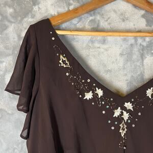 Super cute brown sheer poly chiffon dress, fully lined. Flutter sleeves, tissue hem. Lots of embroidered and beaded trimming. A few missing sequins but nothing noticeable. The perfect chocolate brown color! Made by S.L. Fashions and marked a size 18 W.
