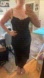 black tank dress with beaded non adjustable straps. keyhole at bust with a twist in the neckline. Cups sewn in. tea length with an asymmetrical hem
