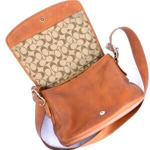 I received this bag with much of the color worn away, it has been restored with a new rustic looking dye job. It is a Y2K Coach Legacy in the color of suntan. The leather is soft and supple, nicely broken in. It's a great looking bag. The lining is signature C tan lining it is in good condition with few marks. It has 1 large slip pocket on the outside, the length of the bag. On the inside there is 1 zip pocket and 2 slip pockets. The bag has a crossbody strap with slider buckle. The hardware is silver and includes the original silver coach hang tag. It's closure is a magnetic snap closure. 8"(H) X 11" (W) X 5" (D) with a strap drop of 20"