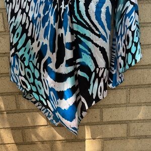 Gorgeous vintage Cache one-shoulder top with a zebra print. Features a mix of black, white, and blue colors. 100% silk. Handkerchief hem and bell sleeve. Truly unique and beautiful.
