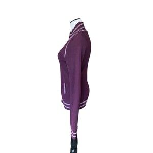 Step into vintage glam with this stunning Y2K-era Cache sweater jacket. Crafted from a luxe silk blend with metallic lurex trim, this deep plum zip-up sweater features a dramatic ribbed funnel neck, full-length sleeves, and eye-catching striped metallic accents at the collar, cuffs, hem, and pockets. The stretchy, body-skimming fit and two-way front zipper elevate the look with true early 2000s energy think mall glam meets apres-ski chic. Rare find for collectors of Y2K fashion or Cache archive lovers.