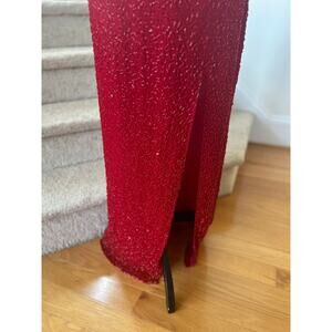 Very good condition, tag has become detached on one side. Vibrant true red, all over breaded and sequins. High neck, open back, criss cross back straps. Zipper at back waist. Knee high slit.