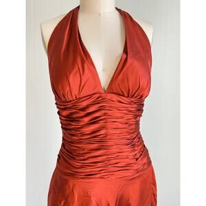 Vintage Y2K Cache Silk Ruched Dress 4 Burnt Orange Rust Asymmetric Fairy Halter
